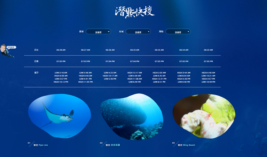 利用API串接技術,將全世界潛點的潮汐、海溫、日出日落的時間精準掌握。